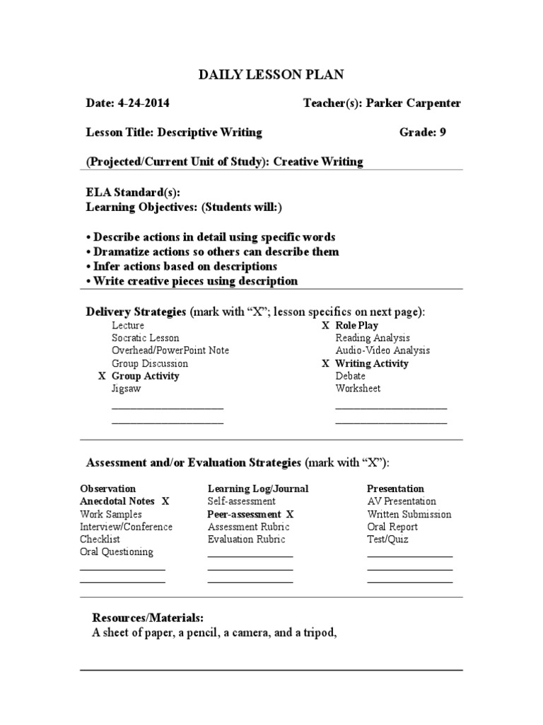 Apr 16, · A distinct section of a piece of writing, commonly dealing with a single subject and designated by a new line, indentation, or numbering. · There are four types of paragraphs that you need to know about: descriptive, narrative, expository, and persuasive. · Descriptive writing describes an object, place, or person in a way that creates a vivid impression in the reader’s mind, assisting the Jan 11, · Resource Description: This detailed lesson plan provides teachers with an introductory lesson to the unit on developing descriptive writing skills. it takes into account the fact that different learners learn differently, thus incorporating Howard Gardner's theory of Multiple Intelligences. It also includes the resources that one could use the classroom, at the same time allowing teachers the descriptive writing lesson plan - Free download as Word Doc .doc /.docx), PDF File .pdf), Text File .txt) or read online for free. Scribd is the world's largest social reading and publishing site